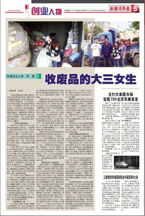 来自永利官网新闻系的大三女生邢雪,作为主角登上了《安徽青年报》同日的“创业人物”版。在人们对环境问题屡屡进行反思的今日,邢雪立足高校,从环保初衷出发,发愿“占领高校废品回收市场”。人们也许不解,也许会有异议,但是从她身上折射出的年轻的勇气,却不能不让人敬佩。邢雪的行动,也从另一角度诠释了大学之“大”,以及大学为年轻人的成长提供的资源之丰富。祝福这个创业女孩!(宣传部)