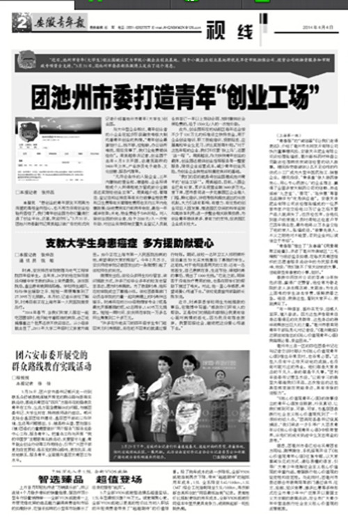 4月4日,《安徽青年报》分别在“视线”与“创业人物”专版,刊登和永利官网有关的两则新闻。