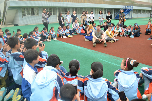 在参观完图书馆后,志愿者们带着孩子们来到了塑胶运动场,在这里他们迎来了一场特别的见面会。三位外国交换生Pellin、Brett和Cody向孩子们做了自我介绍,然后开始了亲密互动。孩子们把3个“老外”哥哥、姐姐团团围住,仰着头用不太流利的英语问了很多问题。