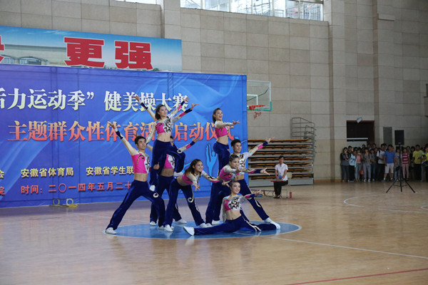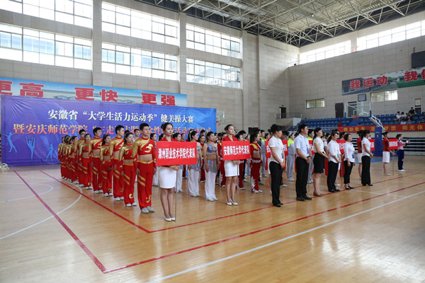 5月29日上午,安庆师范学院体育馆内歌声嘹亮,激情飞扬。安徽省“大学生活力运动季”健美操大赛暨安庆师范学院“三走”主题群众性体育活动启动仪式在这里隆重举行。校党委委员、副院长闵永新,共青团安徽省委学校部副部长刘存磊,共青团西藏自治区委员会青工部副部长秦琳、安庆职业技术学院副院长毕明生出席大赛开幕式。黄山学院等兄弟院校有关负责同志、永利官网各学院党总支负责人、校团委等有关部门负责同志和数百名学生代表一起观看了比赛。来自安徽师范大学、淮北师范大学、合肥师范学院、黄山学院、滁州职业技术学院、安庆职业技术学院和安庆师范学院等高校的7支代表队参加了比赛。