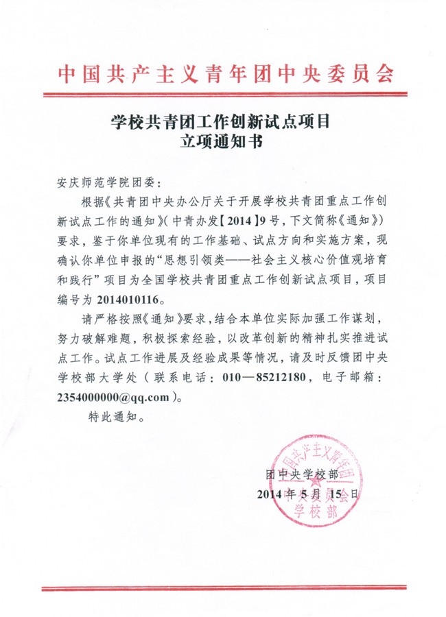 近日,团中央正式公布了全国学校共青团重点工作创新试点项目评审结果,由校团委申报的《社会主义核心价值观融入大学生修身教育全过程》获批思想引领类“社会主义核心价值观培育和践行”方向试点项目,项目编号2014010116,为该类别安徽省唯一入选项目,安徽省共有8所高校获准立项。
