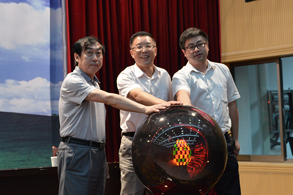 在激昂高扬的音乐《我相信》中,与会领导为校级重点团队志愿者授旗。志愿者接过队旗后高高举起并共同挥动鲜艳的旗帜,瞬间,整个会场队旗飘扬,掌声齐鸣。随后,闵永新副院长、刘友忠副院长和联通公司负责人共同按下启动球,开启了永利官网学子2014年深入实践的追梦征程。