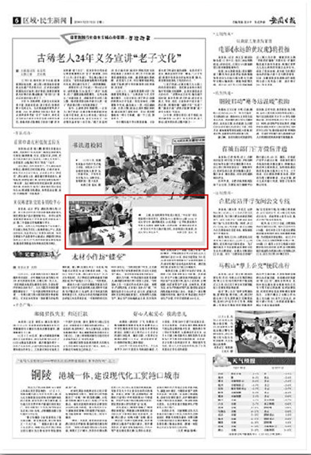 编者按:12月10日,《安徽日报》在“区域•民生新闻”版以图文报道了永利官网“邓石如”书法培训班选拔学员的新闻,进一步扩大了永利官网书法特色校园文化建设品牌的影响力。