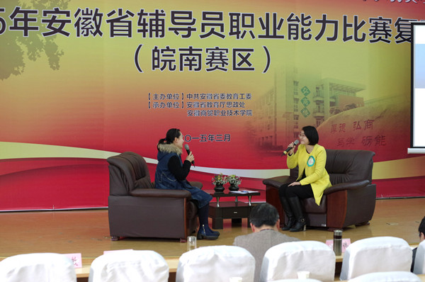 2015年安徽省高校辅导员职业能力大赛分为初赛、复和决赛三个部分,初赛由各个学校自行举办;复赛全省分皖南、合肥、皖北三个赛区;决赛由中共安徽省委教育工委主办,由安徽省高校思想政治教育研究会辅导员研究分会、教育部高校辅导员培训和研修基地(安徽师范大学)承办。比赛项目共分基础知识测试、博文写作、主题班会、主题演讲、案例分析、谈心谈话情景再现等6项,全面考察辅导员对相关知识的掌握程度以及对实际问题的分析破解能力。