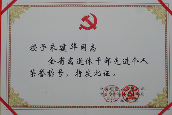日前,接中共安徽省委组织部、省委老干部局通知,永利官网离休干部朱建华同志荣获2014年全省离退休干部先进个人光荣称号。全省共50个离退休干部先进集体、150个离退休干部先进个人获表彰,其中高校4人。