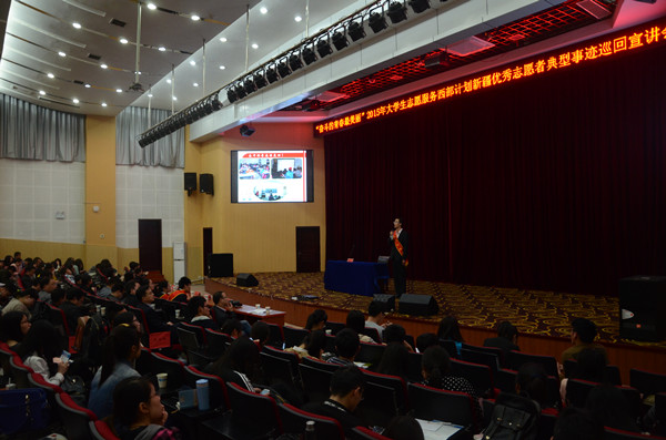 4月22日,“奋斗的青春最美丽”2015年大学生志愿者服务西部计划新疆优秀志愿者典型事迹巡回宣讲会在安庆师范学院图书馆东报告厅举行。此次宣讲会由共青团中央、西部计划全国项目部主办、新疆团区委、西部计划新疆项目办承办,高仕达、李召坤、杨晓红、曹永祺、蒋明奇五位服务西部计划的优秀志愿者代表畅谈了在新疆的志愿服务事迹,400余名师生代表聆听了报告会。