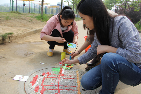 清水清理井盖,粉笔细致打底,颜料耐心涂抹……别看井盖画看上去缤纷多彩,煞是可爱,但是画起来可就没这么轻松了。“我觉得这比在纸上画画难多了,井盖凹凸不平,而且画上去的图案不好修改,没有在纸上的感觉。”今年大一的李凌东,是来自美术学院的“专业人士”,但面对第一次尝试的井盖作画,他的心里也没什么底。在经过自己的仔细构思,并与同伴认真商讨后,李凌东谨慎地拿出画笔,开始在井盖上尽情泼墨挥毫,不一会,一个高耸的振风塔图案便初现雏形,呈现在了原本单调灰白的井盖上。除了在井盖上直接作画有难度之外,这次的创作也给大家的体力带来了严峻的考验。由于创作环境特殊,同学们不得不长期保持蹲姿,在烈日下一笔一画地为井盖添光添彩。正埋头创作的刘志艳同学便是其中一员,已在烈日下蹲了有两个小时的她不得不经常起身,缓解腿部的酸痛。不过当被问及是否劳累的时候,刘志艳却笑着说:“我自己也是被这些非常具有创意和特色的图案设计所吸引了,所以想来尝试一下,虽然出了点汗,但还是让我感受到了极大的快乐和满足。”