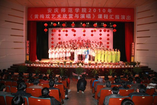 由大学生组成的黄梅戏艺术团,2009年被教育部遴选为“高雅艺术进校园”团队,自2009年至今已经走进20余所高校。近年来,黄梅戏表演本科专业的学生在国家级艺术大赛中获奖就达15人次。如在2012年全国首届黄梅戏广播大赛中,黄梅剧艺术学院2011级潘柠静同学作为唯一的在校生获得全国“十佳”大奖,2010级潘玲玲同学荣获最佳“新人”奖,2009级付亚红、2009级佘畅、2011级江李汇、2012级王媛等同学摘得“优秀演员”奖,学校获最佳组织奖。在中央电视台戏曲频道和安徽广播电视台联合举办的“2013寻找七仙女”活动中,学院共有16名同学参加比赛,最终2011级黄梅戏表演班的潘柠静同学获得“金奖”,2010级潘玲玲同学获得“最佳潜力奖”。在全国性专业戏曲大赛“红梅杯”中,王泽熙同学获得“红梅金花”。这一切都说明国家级特色专业黄梅戏表演本科专业的建设,适应了皖江区域社会的发展需求以及文化强省、文化强国的战略诉求。(储著炎)