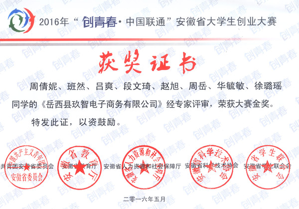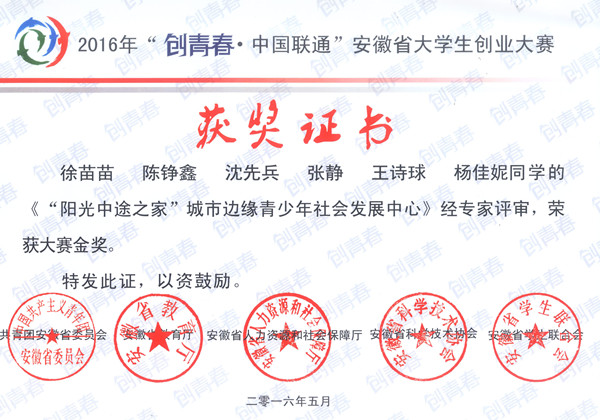 5月29日,“创青春”省级终审决赛举行了封闭答辩。经过分组答辩、专家评审等环节,永利官网人文与社会学院安民兵、张艳老师指导的作品《“阳光中途之家”城市边缘青少年社会发展中心》获得公益创业组金奖;文学院方瑞老师指导的作品《岳西县玖智电子商务有限公司》获得创业实践组金奖。“阳光中途之家”以城市边缘青少年为工作对象,运用社会工作的理念与方法,通过提供能力提升、资源链接、社会关系改善等服务,为城市边缘青少年搭建了一个阳光般的过渡性平台,使其逐步恢复社会功能,最终实现“助人自助”。岳西县玖智电子商务有限公司紧抓电子商务迅猛发展的时代契机,致力于韩国品牌化妆品的国内销售。公司于2015年4月入驻校大学生创业孵化基地,并于2016年2月注册成立公司。现公司月均营业收入40万元左右,本年度营业收入总额440万,公司发展态势良好,销售收入和净利润呈逐月上升趋势。