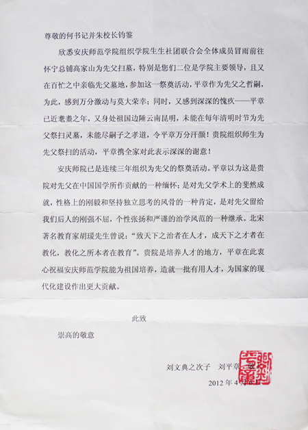 近期刘文典次子刘平章先生特地给校党委书记何小祥和院长朱士群寄来感谢信,以表对安庆师范学院领导师生祭奠其先父的深深谢意。刘平章先生在信中说到自己已近耄耋之年,又身处祖国边陲云南昆明,未能在每年清明时节为先父祭扫陵墓,未能尽嗣子之孝道,令其万分汗颜。对永利官网组织师生为其先父祭扫的活动,携全家表示深深的谢意。