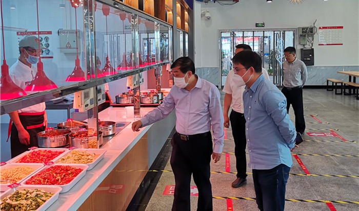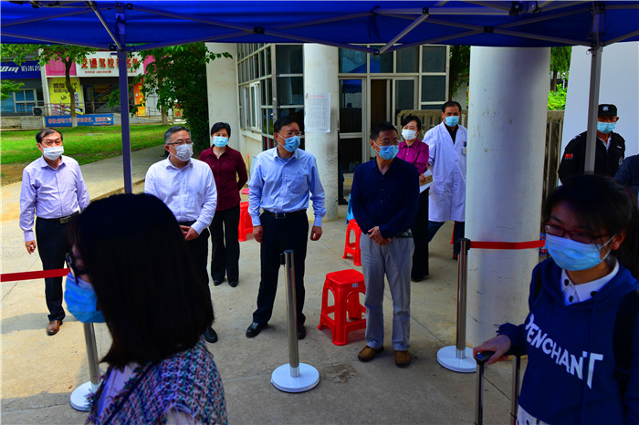 校党委书记许继荣,校长闵永新,副校长汪时珍、刘友忠,纪委书记胡腊香,校党委常委、研究生院院长吴琼、校党委常委、教务处处长苏本跃、校党委常委、组织部长余精华一行前往返校入学检查点和学生食堂,现场检查指导学生返校报到各项工作。