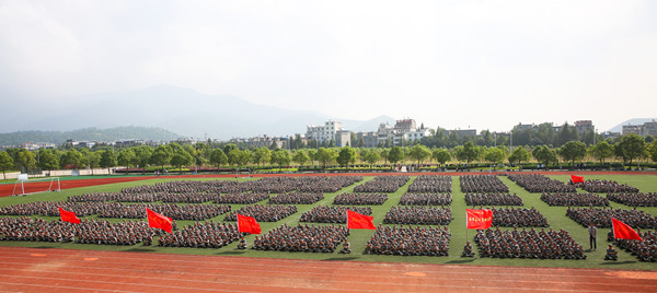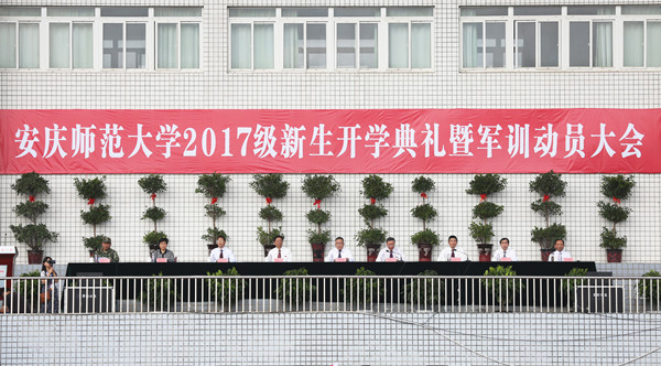 9月12日上午,学校在龙山校区隆重举行2017级新生开学典礼暨军训动员大会,校党政领导许继荣、闵永新、张群、汪时珍、刘友忠、胡腊香,省政协常委何小祥,党委委员、文学院院长、党总支书记方锡球,武警安庆支队一大队教导员徐俊,各学院及其相关部处负责人,2017级全体新生等出席典礼。