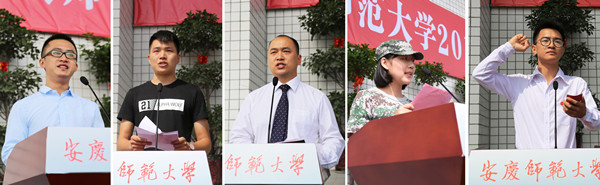 教师代表、音乐学院杨飞虎老师与新生们分享了自己的经验,他希望同学们在大学四年里可以快乐地钻研学问,认真地涵养情怀,勇敢地担当责任,无悔地成就人生。老生代表、2015级法学专业的周兴全,研究生代表、2017级马克思主义理论的张凌桥和新生代表、2017级体育表演专业的李彤彤分别在典礼上发言。