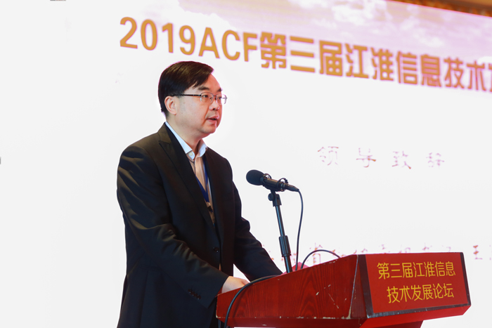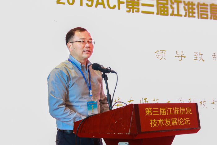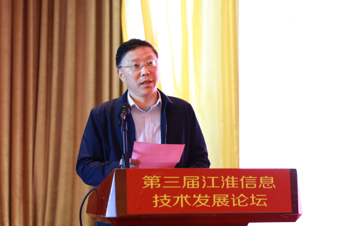 周傲英代表论坛嘉宾致辞,他指出江淮信息技术发展论坛是信息技术领域专家、学者年度交流盛会,对促进安徽省高校信息类学科发展和科技强省发展战略具有指导意义。