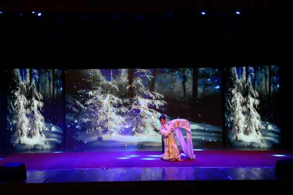 黄梅戏表演专业师生专场演出在汪莉老师演唱的黄梅 歌《梨花颂》中拉开帷幕,清新甜美的歌声伴随水袖舞、团扇舞将黄梅戏的唱腔、身段等元素进行了精彩呈现。本次演出以师生同台的方式进行,是音乐黄梅剧艺术学院艺术实践周的第二个专场演出,包含了歌曲、舞蹈、折子戏等内容丰富的节目。