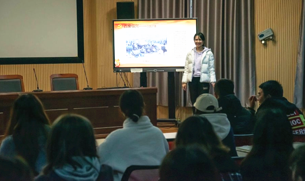一名学生在“永远跟党走”主题班会上分享道:“油画《开国大典》由名家董希文于1953年所做,该画描述了1949年10月1日,毛泽东在天安门城楼上宣读中央人民政府公告,宣告中华人民共和国成立的一刻。”这是美术学院辅导员文雯开展主题班会“探寻篇(画中党史)”的精彩一幕。