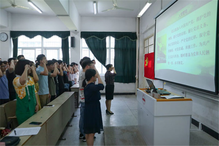 奋进新时代,开启新征程。为了让全体毕业生党员重温入党宣誓时的庄严承诺和坚定决心,在党旗下接受心灵的净化和洗礼,以更加饱满的热情投身各自工作,各院级党组织纷纷组织了重温入党誓词的活动。面对火红的党旗,毕业生党员佩戴党徽,举起右手、握紧拳头,庄严宣誓。在党旗下所立下的誓言,让大家热血沸腾,充满理想,感召大家努力实践,自觉奉献。传媒学院毕业生党员余康生说,在即将离开学校之际,还是很不舍学校的各个地方,在接下来的时间,继续坚持认真学习和生活,始终牢记入党誓词,充分发挥先锋模范作用。