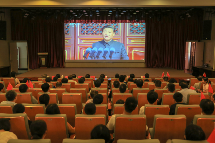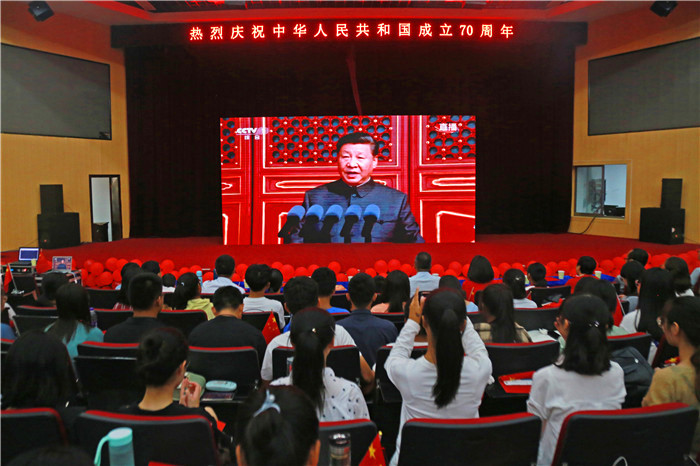 校团委组织留校学生在龙山校区报告厅集中观看庆祝大会现场直播。从10时到12时40分,报告厅内响起了20余次热烈的掌声,欢呼声此起彼伏。