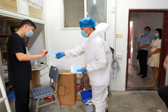 演练设置了两个场景。首先演练学生返校期间校门口工作流程及突发情况的应急处理。在龙山校区东门,由辅导员老师扮演的“学生们”返校进入校门时,分别进行体温检测、48小时核酸检测阴性证明核验、健康码和行程卡绿码验证以及返校身份验证等步骤,就可能出现的突发情况进行了模拟演练。在1号学生公寓,宿舍内出现了“发热病人”,宿舍管理员、校医、辅导员、“班级同学”分别按照应急处理的预案进行了模拟处理。