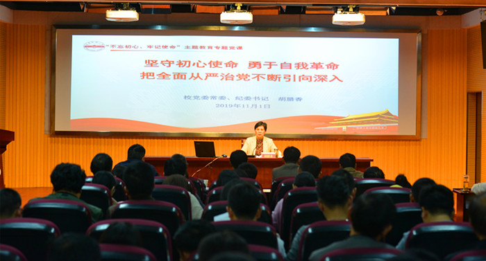 11月1日下午,校党委常委、纪委书记胡腊香作题为《坚守初心使命,勇于自我革命,把全面从严治党不断引向深入》专题党课报告。