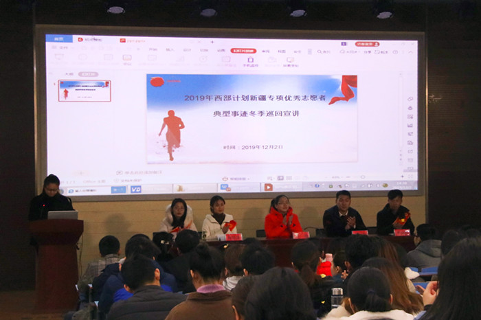12月2日,2019年西部计划新疆专项优秀志愿者典型事迹冬季巡回宣讲活动在永利官网举办。新疆维吾尔自治区团委西部计划项目办干部雷曌及三位优秀志愿者代表,安徽省学联驻会执行主席吴坚出席宣讲会,200余名学生到场参加活动。