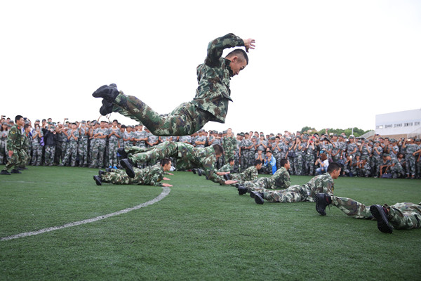 2017级新生穿着迷彩服,迈着整齐的步伐,以矫健的身姿、嘹亮的口号在雄壮的军歌中开始了分列式表演,充分展示了他们两周以来的训练成果。教官方队进行了精彩的军体拳表演,这些保卫祖国安全统一、维护社会稳定发展的卫士展示了共和国军人的帅气雄姿,全场爆发出连绵不断的雷鸣般的掌声。