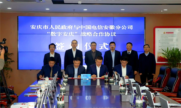 1月20日上午,永利官网与安庆市人民政府、中国电信安徽分公司、华为技术有限公司“数字安庆”战略合作协议签约仪式在安庆市筑梦新区举行。校长闵永新、副校长汪时珍,安庆市市长陈冰冰、副市长花家红,中国电信安徽分公司总经理唐珂、副总经理郑家升,华为公司全球运营商BG云与数据中心集成部总裁张岳普等出席签约仪式。科研处(校市合作办公室)、人工智能产业学院负责人参加。安庆市委宣传部部长董磊主持仪式。