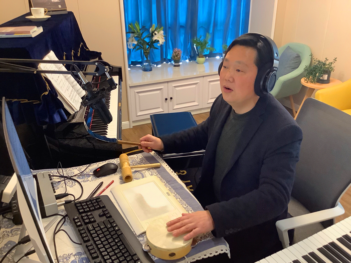 课堂互动气氛活跃,交流热烈。居家上课的同学们视唱曲目时,没有乐器辅助,彭传山教他们因地制宜利用身边的各类生活物品(如家中随处可得的纸杯、牙签盒)自制打击乐器,方式新颖别致,惹人注目,也进一步让学生感受到音乐与生活的紧密相连。师生们用自制乐器开展了单、双声部节奏练习、律动编配练习。师生们一唱一和,交流顺畅,配合默契。