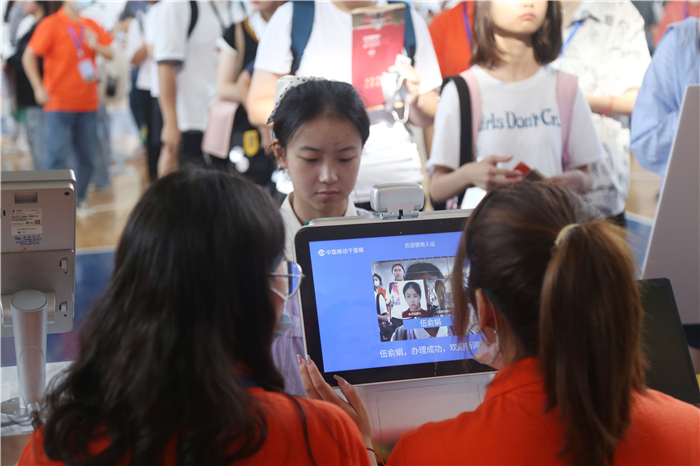 为提高迎新工作效率,今年学校继续沿用“智慧迎新”系统。在迎新现场,新生们只需要将身份证置于指定位置,机器就会启动人脸识别摄像头,自动采集脸部信息,准确快速地识别新生的身份,并且能够自动显示新生的个人信息。体育馆内报到点的大屏实时更新着报到人数。