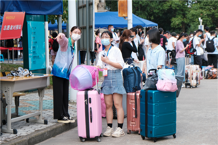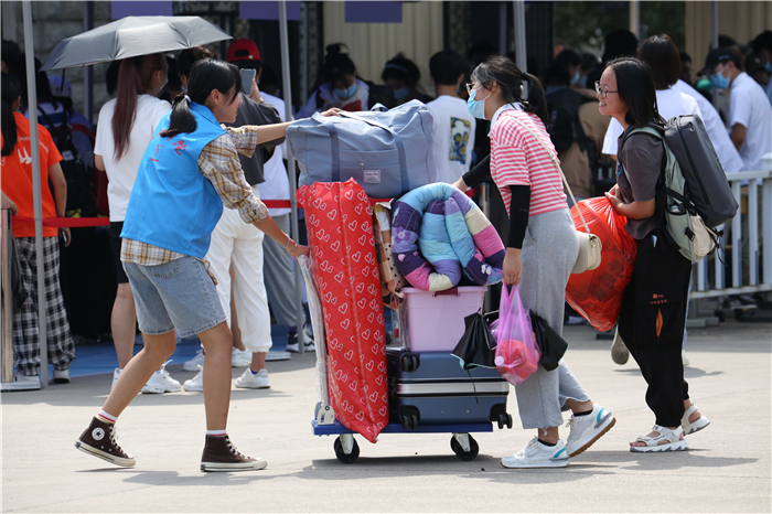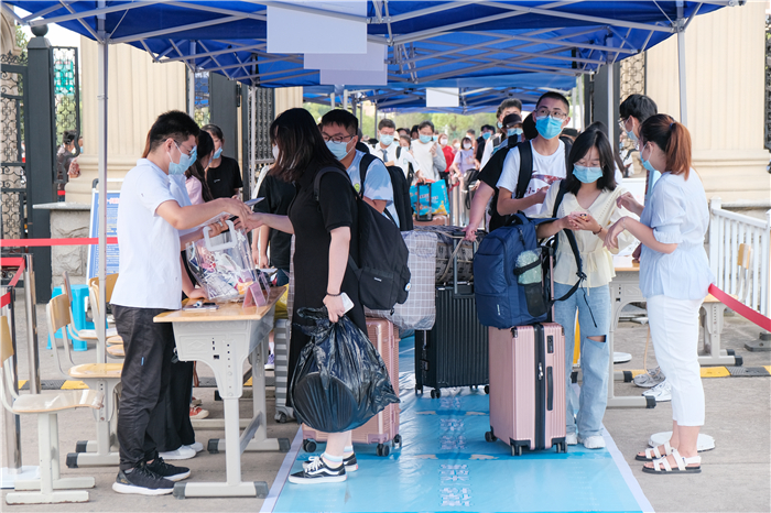 校园内,各迎新工作点人头攒动,宿舍楼前热闹非凡,气氛热烈,却又秩序井然,各项工作有条不紊。为做好疫情防控常态化工作,此次新生报到采取送行车辆及人员一律不进校,学校安排“点对点、人对人”校院两级联动志愿者团队引导新生进行报到的方式。生命科学学院2020级志愿者汪子玄满怀激情地说:“去年学长学姐给我很多帮助!我很感激!今年我要把这种精神传承下去!”新生经过体温检测、出示健康码、核酸检测阴性证明、身份验证等进入校园到各学院报到点进行报到。志愿者亲切引领新生办理入学手续,耐心回答新生问题,热情介绍学校情况,帮助新生搬运行李。一名不愿透露真实姓名的研究生新生面带羞涩地说:“志愿者们真的很好!很棒!又是引路又是帮拿行李,从体育馆送到西门宿舍,最后帮我把行李搬到6楼宿舍,路上还有志愿者提供免费的水。第二天,接我的志愿者带我熟悉学校环境,让我充分感受到学校的爱与温暖。”