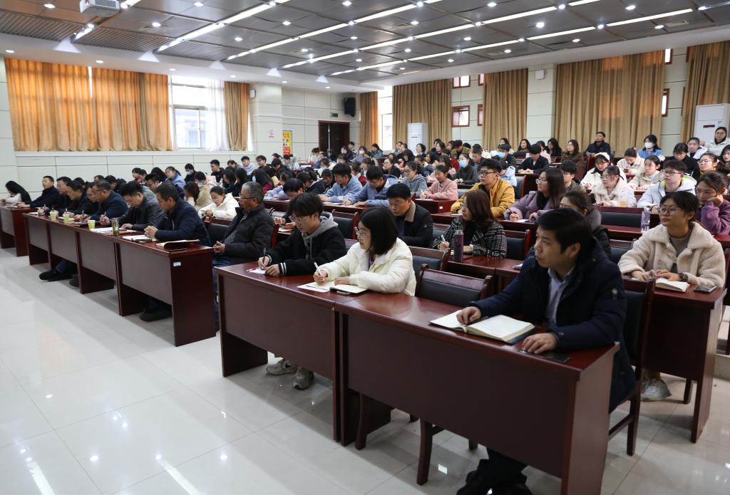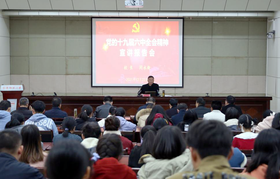 12月23日,校长闵永新在龙山校区行政楼一楼会议室作学习宣传贯彻党的十九届六中全会精神宣讲报告。外国语学院、教师教育学院等学院师生代表,发展规划处、教务处、审计处等部门教职工共100余人聆听了报告会。