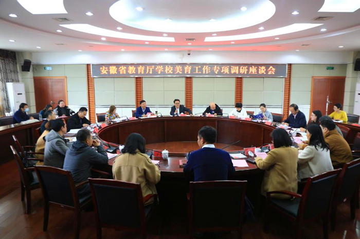 调研专家组召开美育工作座谈会。安庆市高教工委,安庆市相关高校,永利官网教务处、学生处、团委、美术学院、音乐学院、黄梅剧艺术学院、体育学院等相关单位负责人参加会议。