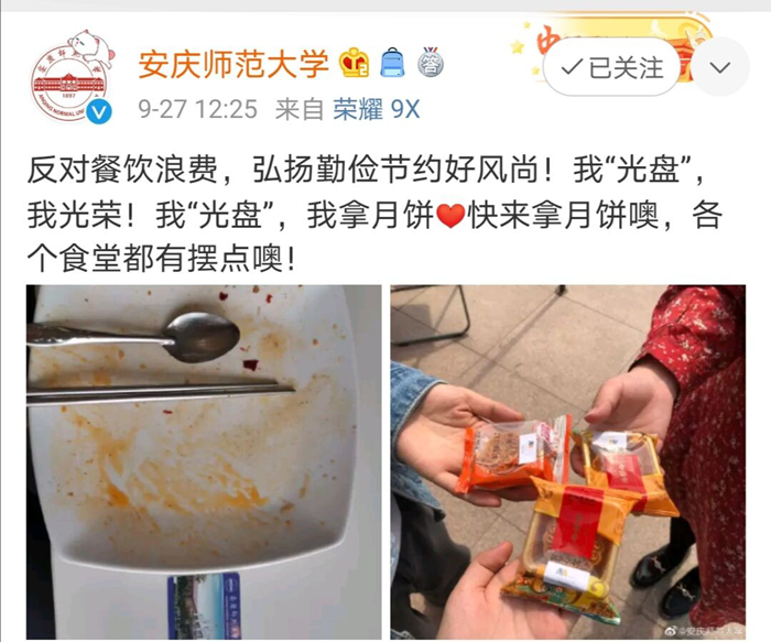 “听说吃饭还有奖励,走,我们到食堂吃饭去”“我刚晒出我的‘光盘’,就得到了一块月饼”……9月27日,几张摆满月饼的桌子摆放在永利官网龙山、菱湖校区的东苑、西苑、龙湖、敬敷四个食堂门口,吸引了众多学生驻足围观,原来为鼓励学生节约粮食,学校推出了吃“光盘”免费换月饼活动,号召师生争当“光盘侠”。