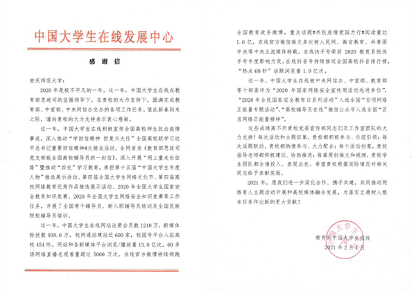 2020年度,永利官网多措并举,聚力“三全育人”,努力开创网络育人新局面,积极参与教育部“中国大学生在线”发起的各项活动:积极宣传永利官网师生抗击疫情的先进事迹;踊跃参与“学回信精神 担复兴大任”全国高校联学习习近平总书记重要回信精神@大接龙活动;深入开展“网上重走长征路”暨推动“四史”教育;师生积极参与第四届全国大学生网络文化节、第四届高校网络教育优秀作品推选展示活动等。积极推动高质量网络校园文化建设,努力打造网络育人精品项目,运用丰富生动的网言网语唱响主旋律、传播正能量,讲好师大故事,取得了显著成效。