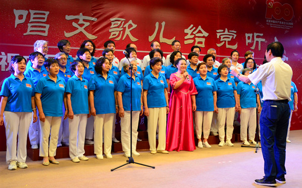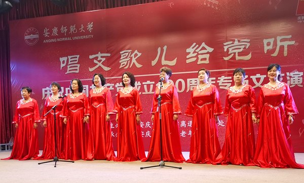 文艺演出在大合唱《没有共产党就没有新中国》中拉开序幕。歌曲《山丹丹开花红艳艳》、舞蹈《唱支山歌给党听》、柔力球表演《永远跟党走》、黄梅戏表演唱《梅花恋》、男声独唱《江山如此多情》、诗朗诵《颂歌献给党》、服装表演等一个个形式多样的节目轮番上演,你方唱罢我登场,生动再现了中国共产党带领中国人民和中华民族走向光明的百年奋斗历程。