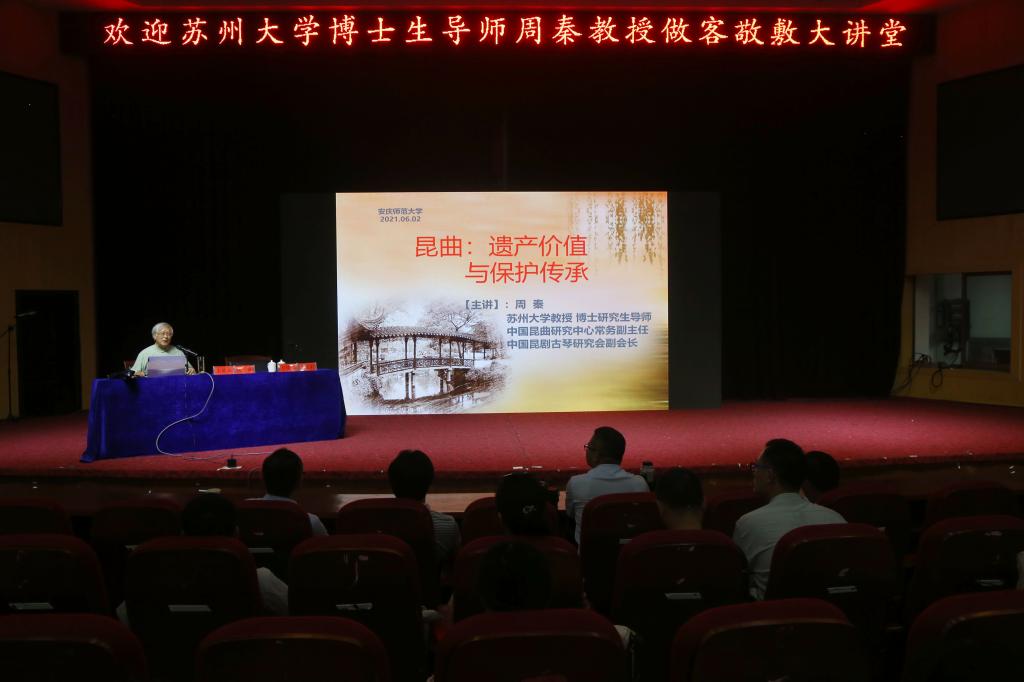 6月2日,苏州大学博士研究生导师、中国昆曲研究中心常务副主任周秦教授做客敬敷大讲堂,在龙山校区图书馆东报告厅畅谈“昆曲的遗产价值与保护传承”,为现场的300余名学生和观看网络直播的6万余名观众带来了昆曲艺术与文化。