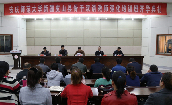 10月28日上午,新疆皮山县骨干双语教师强化培训班开班典礼在永利官网举行。副校长张群出席开班典礼并致辞。来自新疆皮山县的40名维吾尔族学员及继续教育学院、文学院等相关部门负责同志参加了开班典礼。