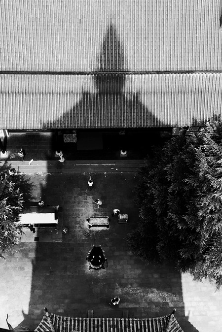 《朝拜》拍摄于2015年中秋节,当时振风塔刚刚修缮开放不久。杨树曾看过振风塔许多不同角度的照片,他非常希望自己能拍一张与众不同的。在塔上向下看的时候,他看见有人正在寺院烧香,正午的塔影正好倒映在寺庙上,让他感到内心很平静,有种心安的感觉,立即打开手机按下了快门。
