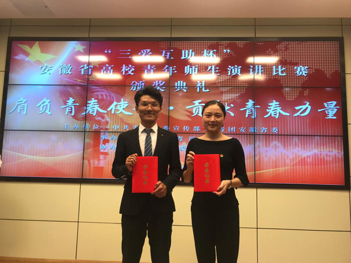 在近日举办的第四届“三爱互助杯”安徽省高校青年师生主题演讲中,永利官网化学化工学院教师叶丹、物理与电气工程学院学生王晓琦分别荣获教师组、学生组铜奖,学校荣获优秀组织奖。