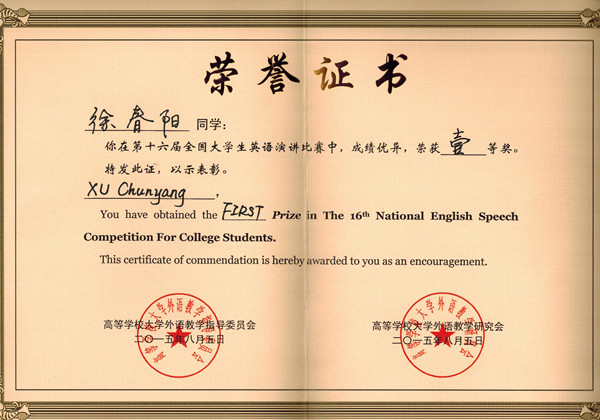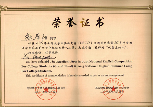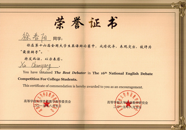 此外,徐春阳同学经过两轮节目遴选,以英文歌曲—Cry on My Shoulder入围8月3日晚第九届全国大学生英语风采大赛决赛,并荣获三等奖。徐春阳同学还参加了本届大学生英语夏令营主持人竞选活动,经选拔入围本届夏令营主持人阵营,并于8月5日主持全国大学生辩论赛决赛,荣获“优秀主持人”称号。徐春阳同学在比赛和夏令营活动期间表现突出,被组委会授予“优秀营员”、“优秀参赛选手”等称号。