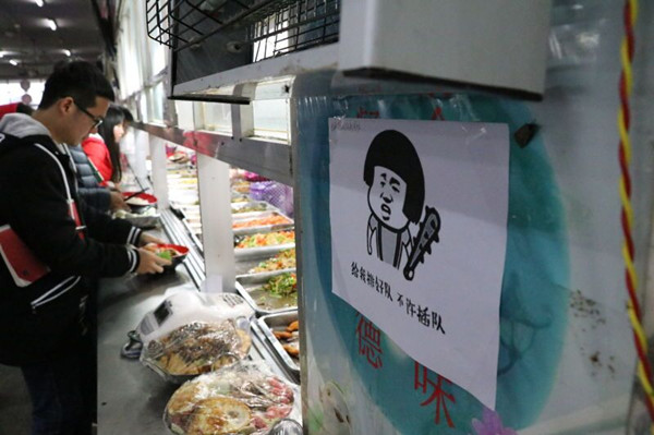 “我看看是哪个小可爱在插队”、“厉害了,进桶了”、“讲文明的都是好宝宝”……接地气的标语以诙谐的方式传递同学们倡导的文明观念。