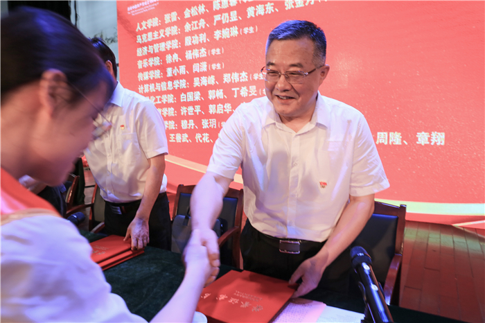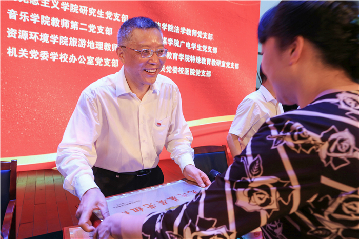 许继荣代表学校党委向长期以来辛勤工作在教学、科研、管理和服务等一线的全体党员,向曾经为学校建设发展做出贡献的离退休老党员,向勤奋学习、敢于创新、勇于探索的青年学生党员致以节日的问候。向33名“光荣在党50年”纪念章获得者,向受表彰的85名优秀共产党员、优秀党务工作者和19个先进基层党组织表示热烈的祝贺。