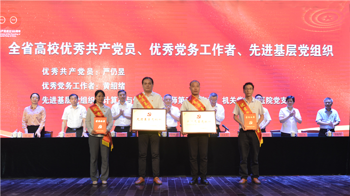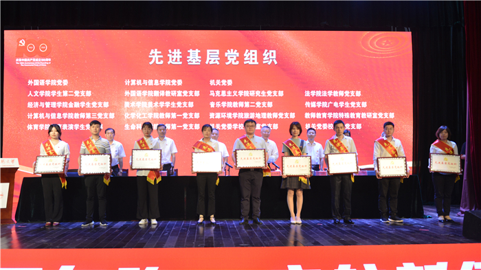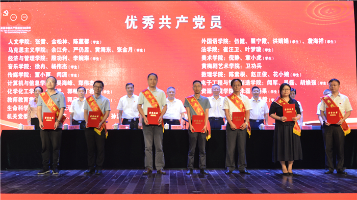 吴照明宣读了《关于表彰先进基层党组织、优秀共产党员、优秀党务工作者的决定》。计算机与信息学院教师第三党支部、校医院党支部荣获全省高校“先进基层党组织”荣誉称号,严仍昱荣获安徽省高校“优秀共产党员”荣誉称号,黄绍绪荣获全省高校“优秀党务工作者”荣誉称号。外国语学院党委等3个党委和人文学院学生第二党支部等14个党支部荣获学校“先进基层党组织”荣誉称号,张磊等51名同志荣获学校“优秀共产党员”荣誉称号,陈宗俊等32名同志荣获学校“优秀党务工作者”荣誉称号。