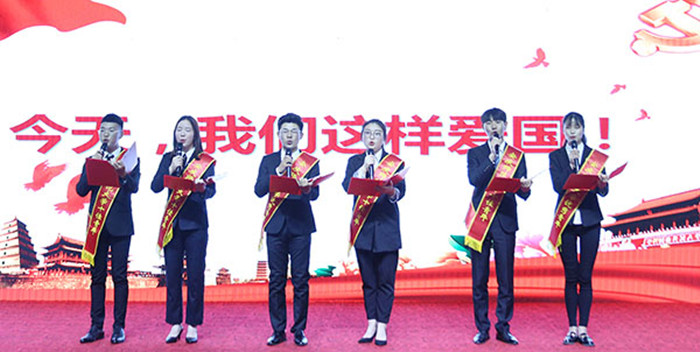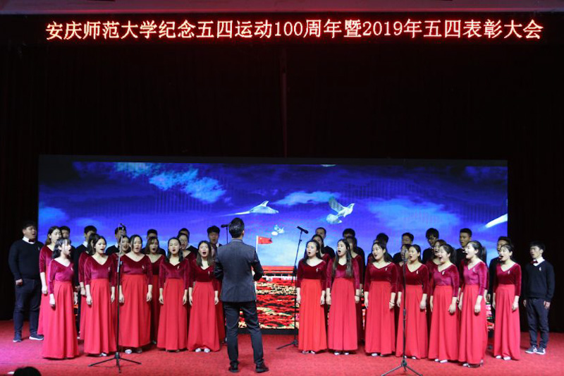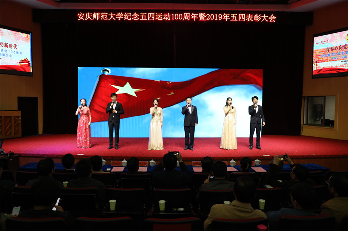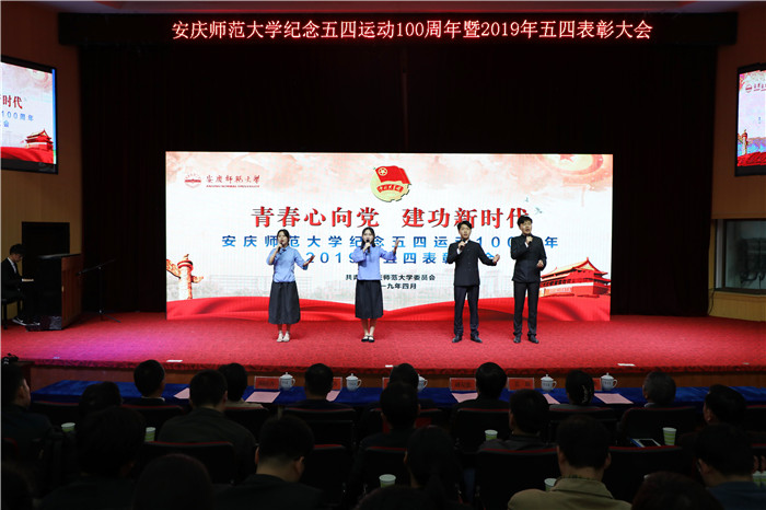 表彰大会现场,音乐(黄梅剧艺术)学院和校团委精心组织了精彩的文艺节目。合唱《不忘初心》,小合唱《我们都是追梦人》、《五月的鲜花》、《共祝中国梦》等给大会增添了浓厚的青春气息和热烈气氛。特别是由6名“十佳青年”代表带来的原创朗诵《今天,我们这样爱国》将大会气氛推向高潮,“我们修德明理,修智敏学,修行律己。我们勤学笃行,青春心向党,听候祖国的召唤,建功新时代”的誓言赢得台下阵阵掌声。
