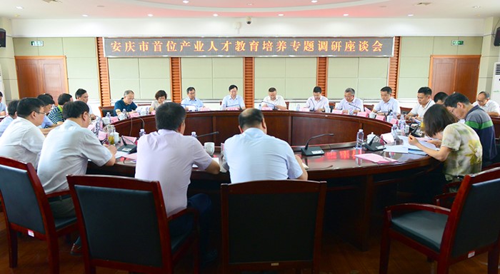 7月29日上午, 安庆市市委常委、组织部长、统战部长胡红兵,市委常委、副市长花家红,副市长王爱武带队来永利官网调研首位产业人才教育培养工作,并召开专题座谈会研究产业学院建设工作。校长闵永新、副校长汪时珍陪同调研并出席座谈会。