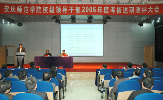 安徽省委教育工委考核组组长张裕全同志在会上作了重要讲话。他强调了高校领导干部年度考核的重要意义,并就年度考核的对象、内容、方法和步骤作了说明,提出了明确的要求和希望。他强调:一要坚持实事求是的原则,搞好述职述廉。二要按照科学发展观的要求,准确地评价干部。三要以严肃认真的态度,填写好有关表格。四要加强对年度考核工作的监督。