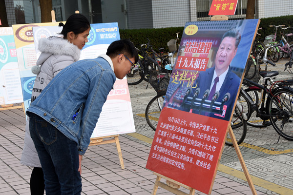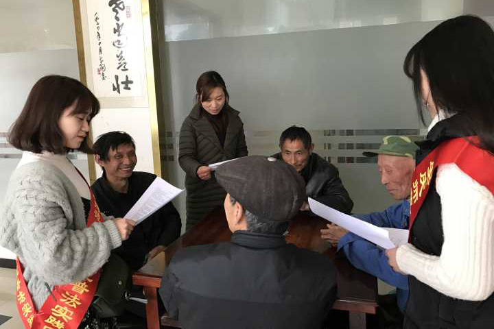 法学院还积极组织“宪法与十九大精神学生宣讲团”走出校园,宣讲团以“法律六进”即走进机关、社区、农村、学校、企业和车站等形式对十九大与宪法精神进行宣讲。宣讲团成员刘显表示:“作为宣讲团的一员,我竭力将宪法与十九大精神讲清楚、讲生动,让听者能听懂、能领会。”在燎原社区的老党员李大爷家中,宣讲团成员为老人送去党的十九大学习资料,并为视力不好的老人朗读了十九大报告中与法治相关的内容。