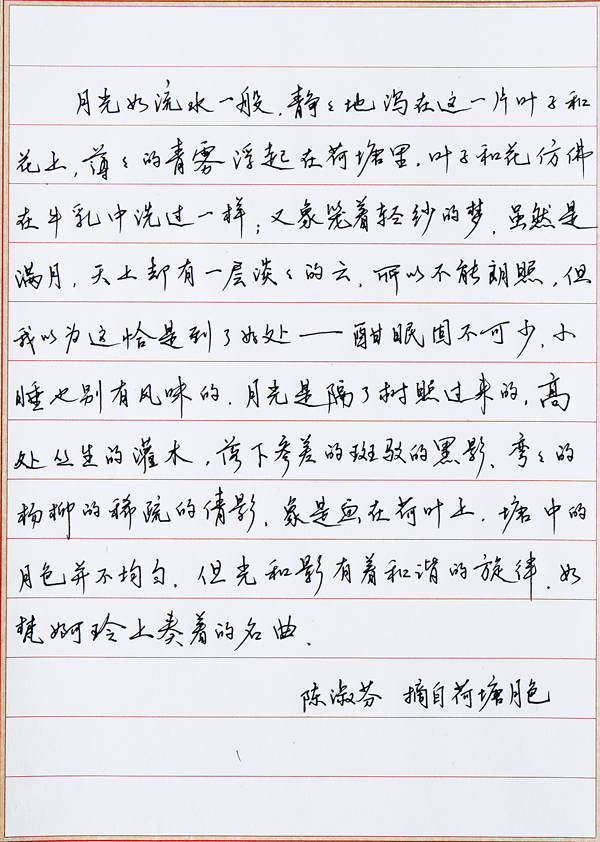 该班同学课余坚持练习书法,通过努力,他们的书写能力大大提高,大部分同学都能写上一笔工整清爽的好字,部分同学书写已经具有相当的水平。这次刊登的九件硬笔作品笔画有力,结体多变,楷行兼备,风格多样,较好地展现了该班同学良好的书法艺术修养。