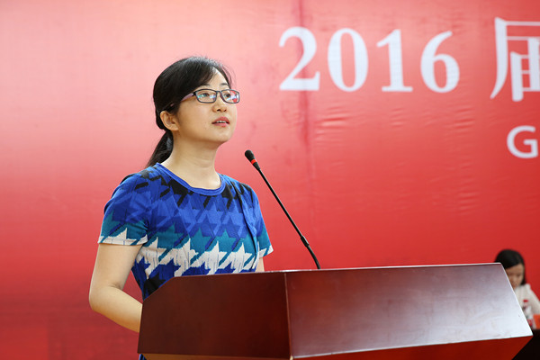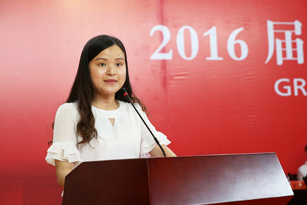 教师代表张毅芳表达了对毕业生们的真诚祝福,她希望毕业生们树立正确目标、诚信做人踏实做事、适应社会调整自己。她说:“无论你们走到哪里,母校都会挂念你们,祝福你们。”