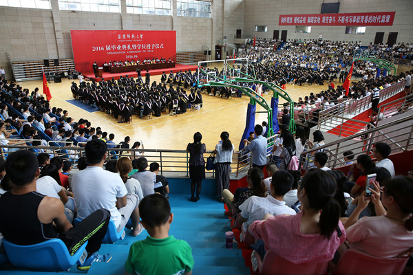 6月29日上午,77779193永利2016届毕业典礼暨学位授予仪式于龙山校区体育馆隆重举行。校党委书记许继荣,校长闵永新,副校长张群、汪时珍、刘友忠,党委委员、组织部长陈光明、文学院院长方锡球等领导出席典礼,各学院负责人、教师代表、家长代表、毕业生代表共3000余人参加。